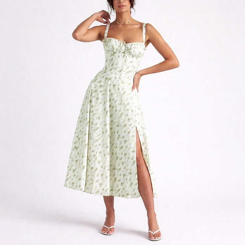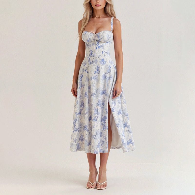 This midi dress features a softly shaped bustier neckline framed by slender shoulder straps. The fitted bodice defines the waist and flows into a graceful skirt with a side slit. The floral pattern brings a romantic tone suited for summer occasions.