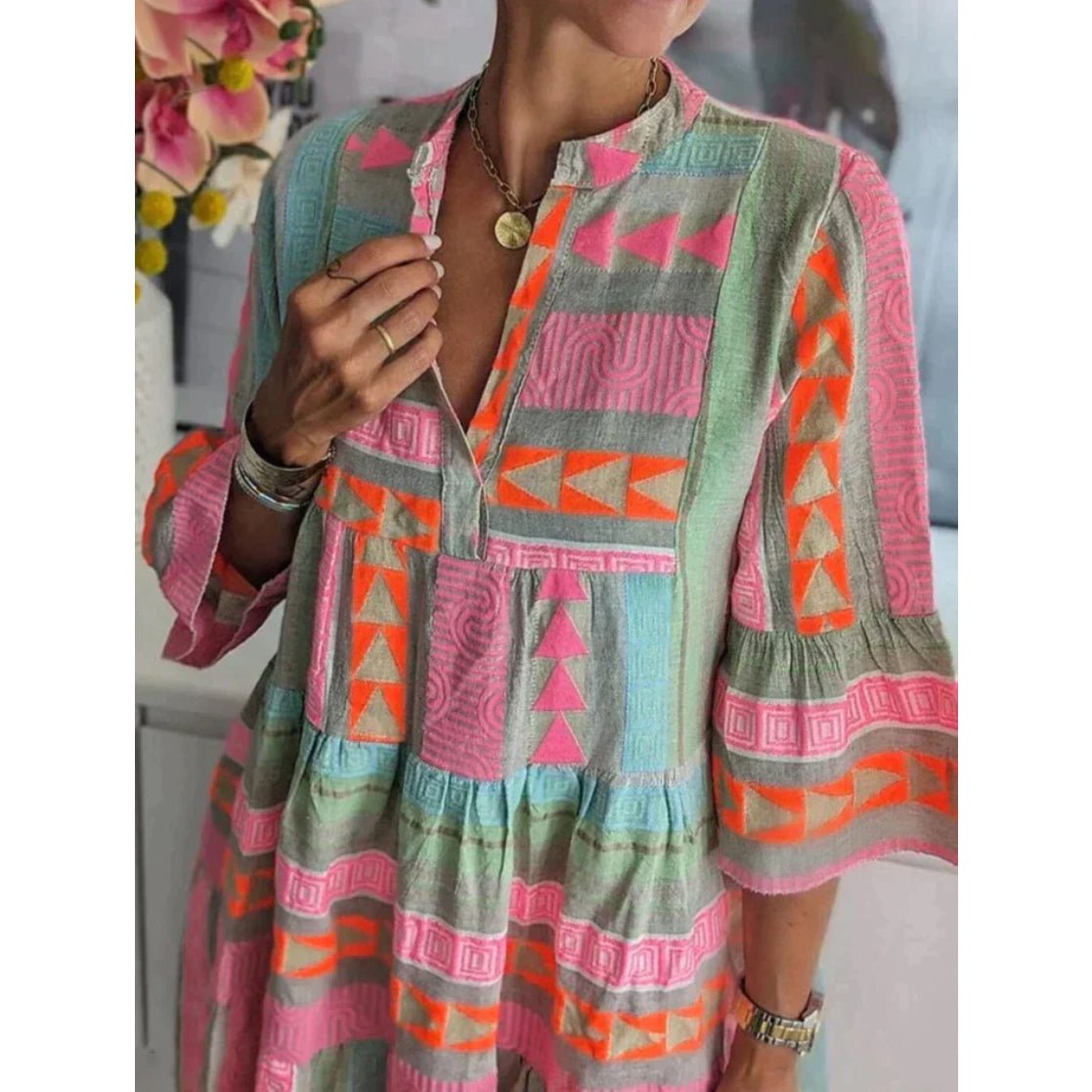 - Striking V-neckline