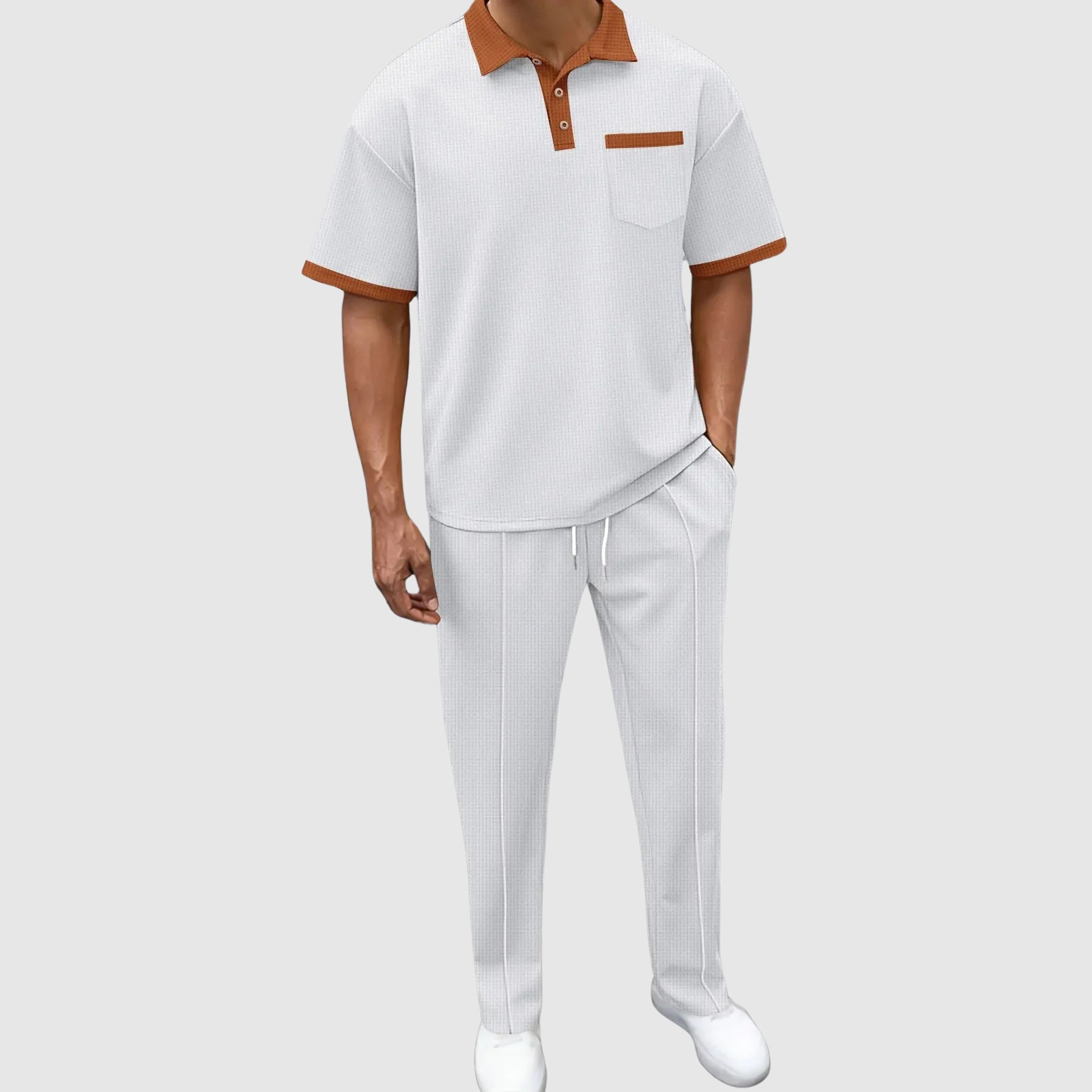 The Prescott Tailors Urban Lounge Set blends effortless style with modern sophistication. Its breathable knit fabric and rich caramel accents add a refined touch, while the relaxed polo and tailored drawstring pants create the perfect mix of comfort and polish—ideal for city life or upscale lounging.
