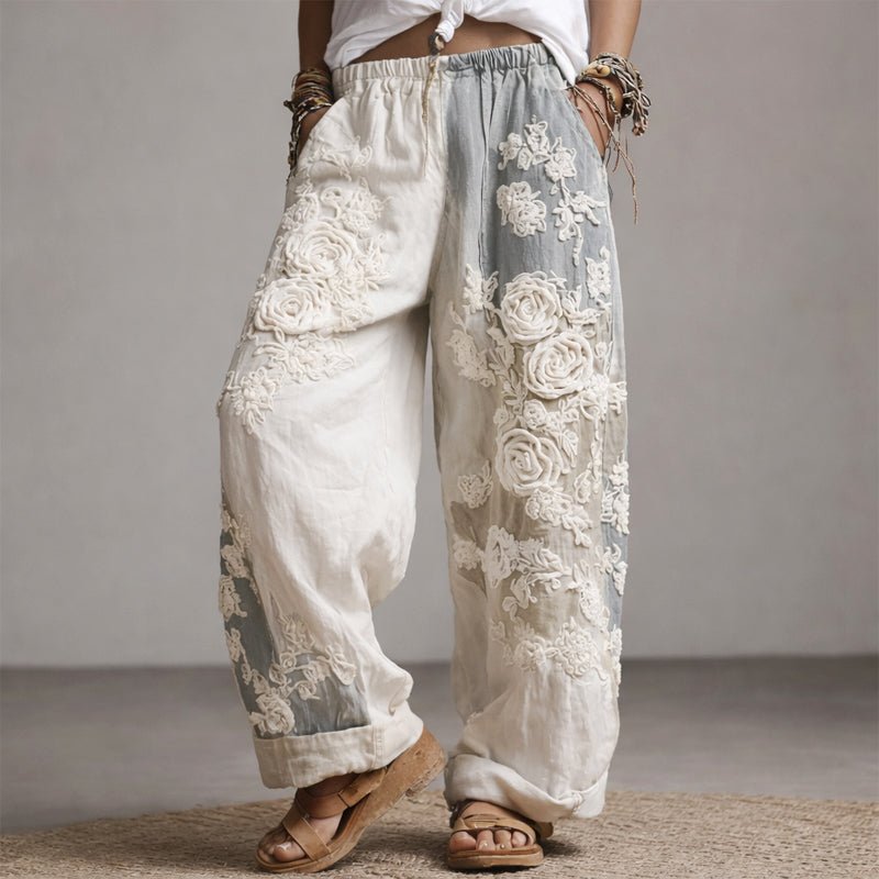 These wide-leg pants create a flowing silhouette suited for relaxed everyday outfits and vacation looks. The floral embroidery adds gentle texture and visual detail to the design.