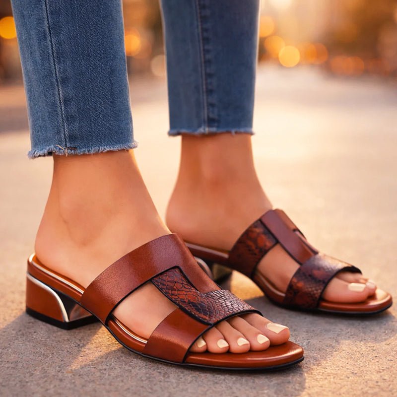 Snake pattern panels add a bold visual detail across the strap design of these sandals. The open-toe shape and low block heel create a structured silhouette suited for casual outfits or relaxed evening styling.